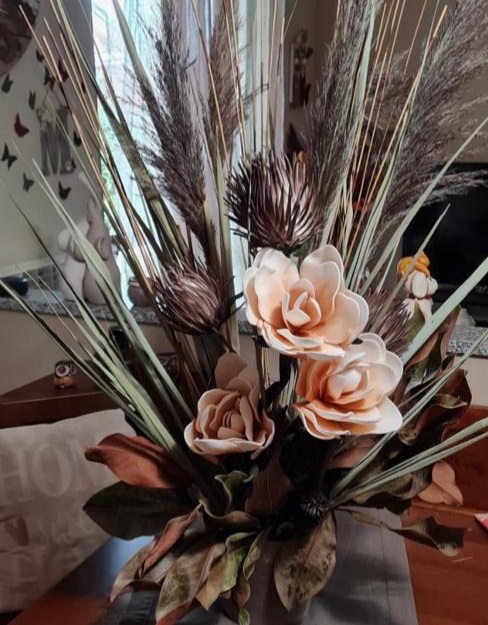 Composizione con fiori in lattice contornate da foglie di vera palma e fiori di frumento trattati